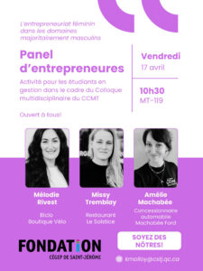 - Animé par Karine Molloy, ce panel réunit des entrepreneures des Laurentides, anciennes étudiantes du CCMT, qui partageront leur parcours, leurs défis et leurs apprentissages dans des milieux encore majoritairement masculins. À travers une discussion conviviale et accessible, elles offriront des conseils concrets pour se lancer et persévérer en entrepreneuriat.